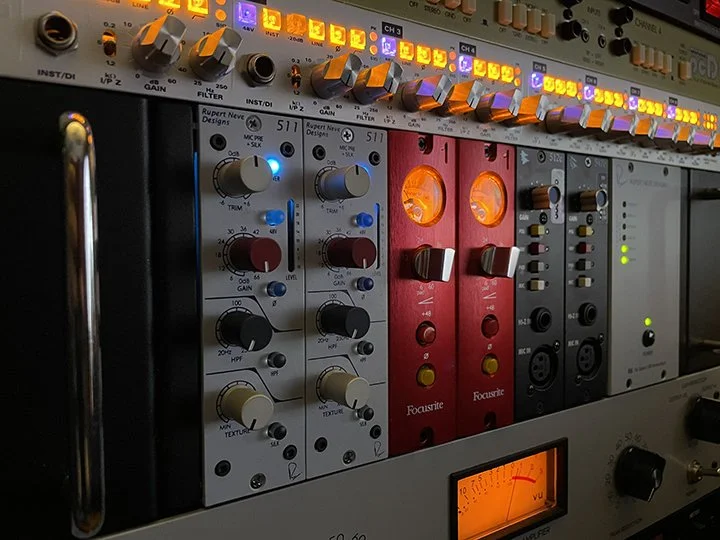 I took a few photos to show the setup. One of these days I want to get one of our student bands in the studio and record an EP or something completely old-school—no Pro Tools. No computer. Just straight to the tape machine, using console EQ, faders (automation means you move it yourself at the right time), outboard processors, and so on. That’d be a total blast. BTW, see the cables patched into the console below? That’s where the term “plug-in” comes from; you’re literally plugging in an outboard compressor or whatever into the console channel, just like in a DAW.